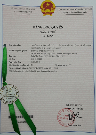 Bằng sáng chế độc quyền có tên “Chuỗi các cánh diều có cơ cấu bám dây tự động và hệ thống chuỗi diều thu năng lượng gió” của TS. Trần Thế Trung – Viện trưởng FTRI – và cộng sự TS. Lê Ngọc Thúy được cấp ngày 12/11.