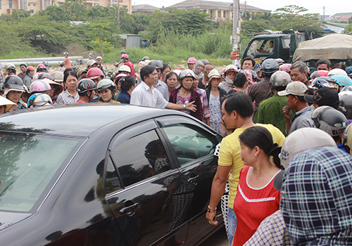 Hàng trăm tiểu thương vây quanh xe của Phó chủ tịch TP Huế trước UBND phường Phú Hậu để giải bày nguyện vọng trước quyết định di dời đến khu chợ mới. Ảnh: Đắc Đức. |