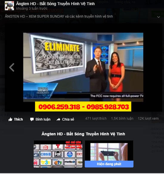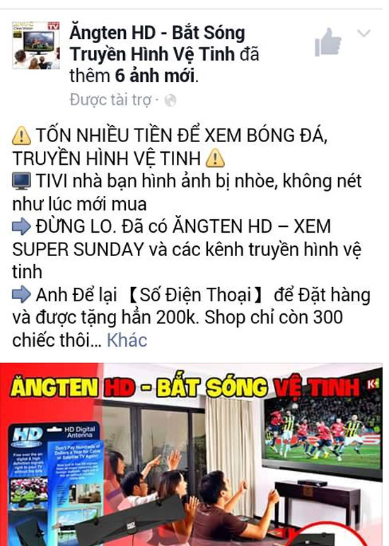 Để che giấu hành vi lừa đảo của mình, trang bán hàng trên không ghi chỉ dẫn địa chỉ cửa hàng cụ thể mà chỉ công bố 2 số điện thoại bán hàng. Trên trang cũng up 2 video mô tả công dụng của loại anten này và “nổ” là đã được thử nghiệm thu truyền hình vệ tinh ở Mỹ, nhưng có nội dung bằng tiếng Anh. Với lời quảng cáo hấp dẫn, trang Facebook đã có gần 7.000 lượt like và số lượng người tương tác để mua sản phẩm lên tới hàng chục nghìn.