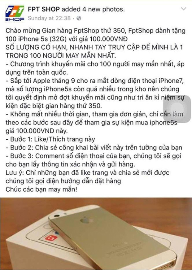 Fanpage giả mạo này lấy logo cũ của FPT và gắn thêm cụm từ FPT Shop và đăng tải những thông tin quảng cáo không có thật về chương trình khuyến mãi tặng 100 iPhone 5s 32 GB với giá chỉ 100.000 đồng cho 100 người may mắn nhất.